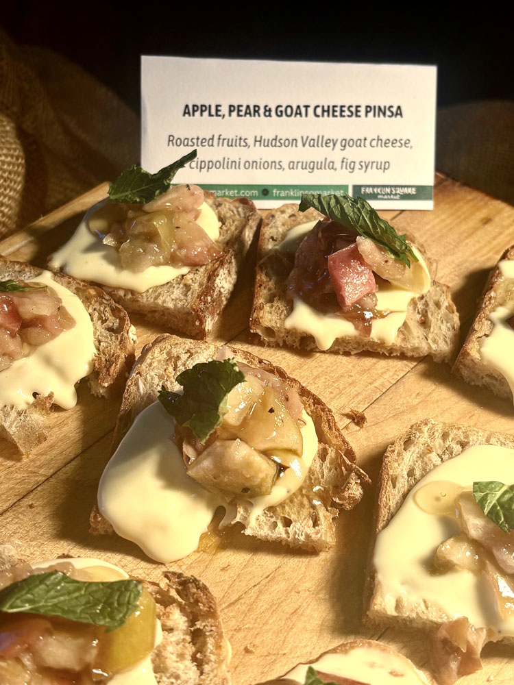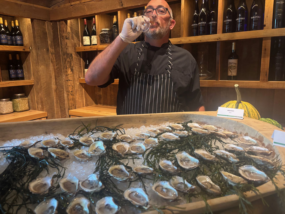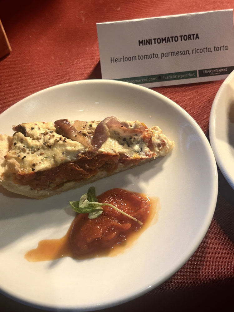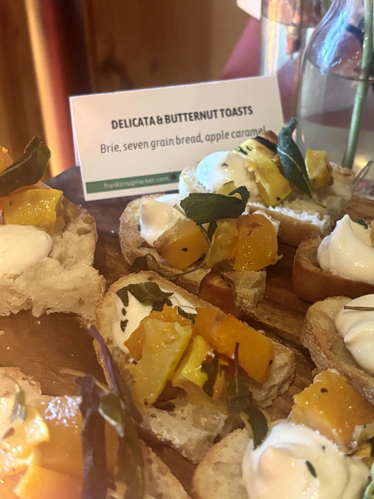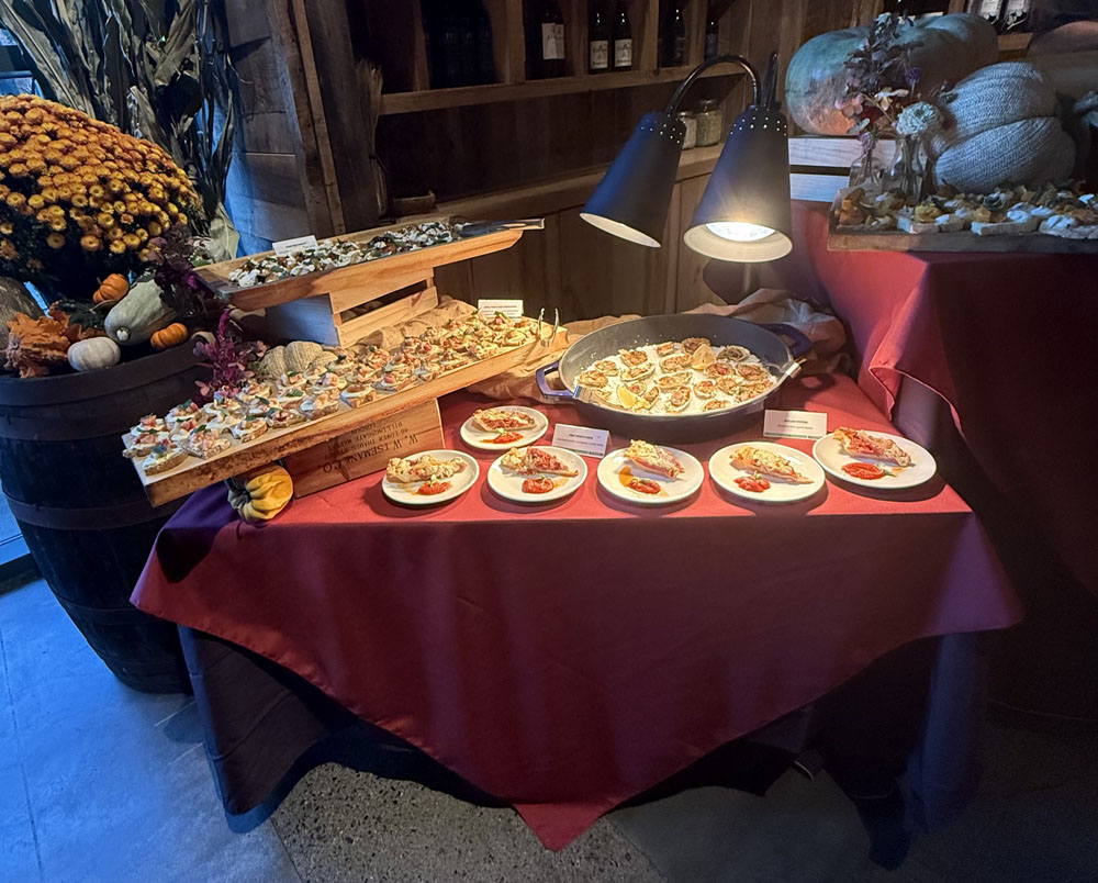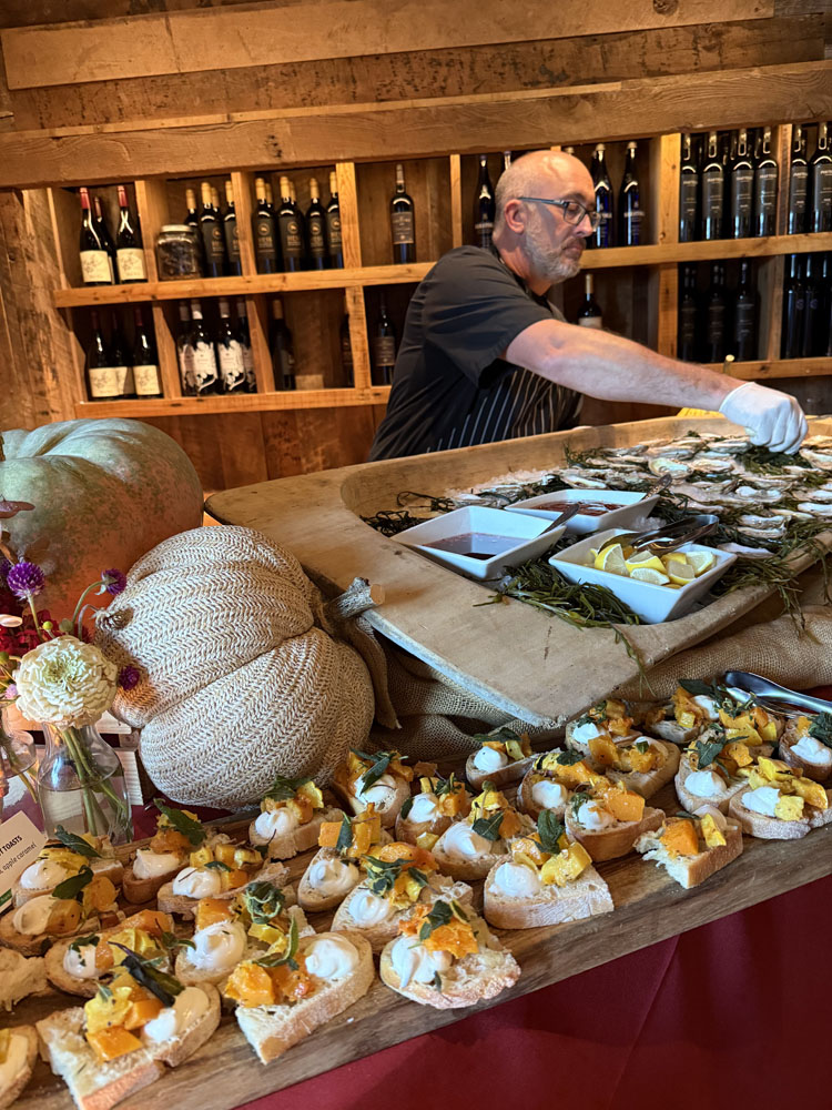 Six months after Franklin Square Market opened, its founding partner left. Enter two veterans of the Capital Region food scene, Maître Rôtisseur Mark Delos, the market’s Director of Culinary, and wife Jullie, Director of Hospitality and Operations. For the Albany Chaîne’s visit, Chef Delos devised a menu that bestowed whimsy on classics, and Jullie added the warmth of a haybarn party in autumn. Colossal dried hydrangeas proclaimed the season on a reception table where leaf-patterned Candelaria burned. Light bounced off rows of gleaming stemware on side tables, omens of seven wines to come at dinner. Tall cornstalks, mums, and pumpkins adorned a canapé table—my favorite was burrata with grilled peaches and plums, roasted onion, and mint. And then there was pizza, tada! Billed as ‘Mini Tomato Torta,’ slim triangles of moist, featherweight dough underpinned warm ricotta, parmesan and heirloom tomato confit. Inches away rested a platter of oysters grilled with pancetta herb garlic butter, and a nearby elaborate raw oyster bar drew fans. Crab cakes passed by on trays, while at each place setting a party favor waited: a bar of Fleur de Sel from Saratoga Chocolate Company.