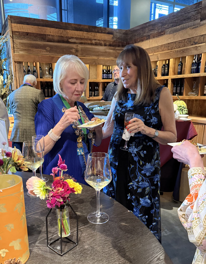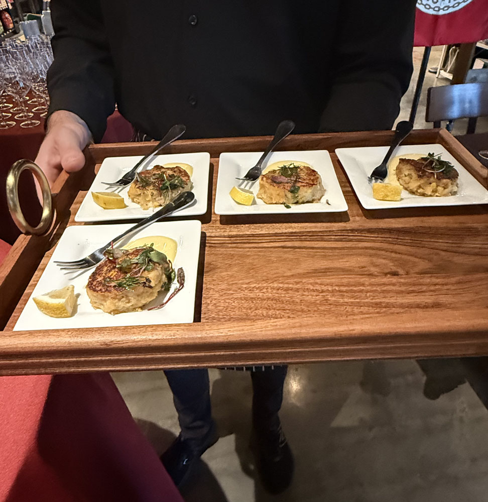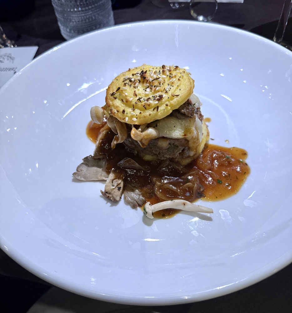 Next on the carte was—you guessed it—meatloaf. Wagyu beef sliders and tangy melted cheddar came swathed in cippolini onion gravy with mushrooms from a local grower, topped by a slider bun look-alike of potatoes duchesse, and paired with Caymus Vineyards Cabernet Sauvignon, Napa Valley 2013. As Echanson Provincial Hon. Joel Hodes observed, “It was fully mature, ready to drink, and all about fruit. Sweet red cherries, hints of cranberry and red currants…the wine paired beautifully with the seasonings in the Wagyu.”