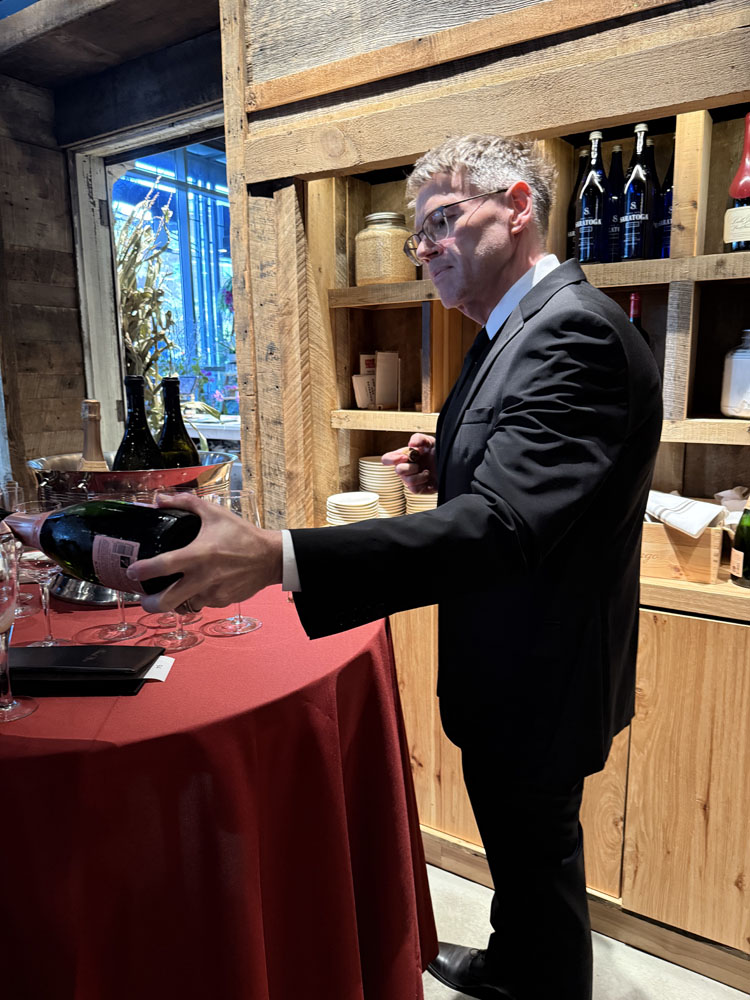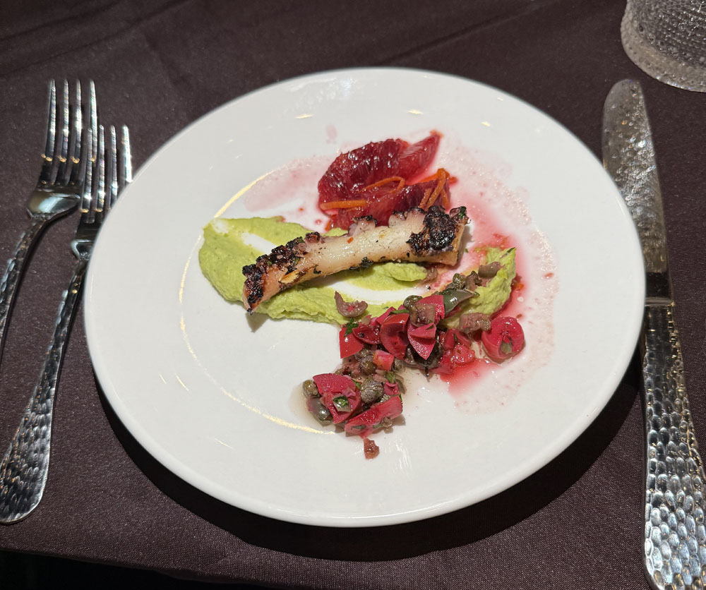 A second course of grilled octopus brought a controlled whiff of smoke from the grate, the seafood’s plush texture contrasted by Castelvetrano tapenade, guanciale, and preserved blood orange. Chef Richards explained, “I look at these pairings from a chef’s perspective. Not what the wine is, but what the wine does for the food, and the food to the wine.” In this case the octopus paired with Domaine Sangouard-Guyot Pouilly-Fuissé “Quintessence” 2021, a wine Richards added, “…has depth and acid to hold up to the salt…blood orange is the bridge between this dish and the wine.”