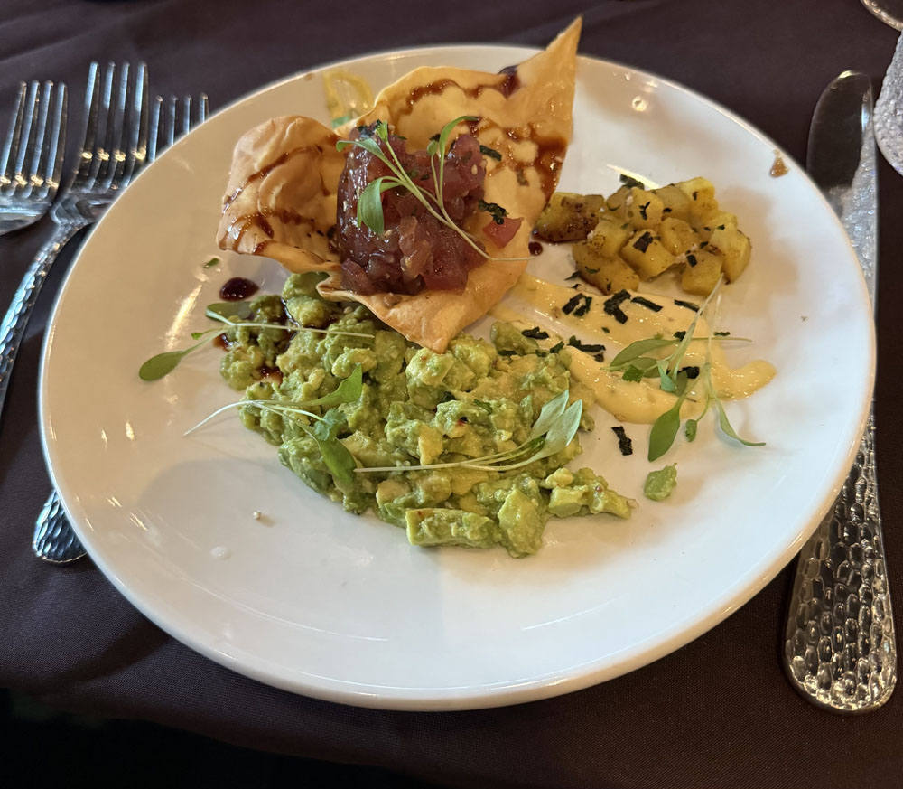 Bailli William Harris tapped Maître Rôtisseur A.J. Richards, chef/owner of [farmacy] restobar in Glens Falls, New York to comment on the first course, ahi tuna in crispy wonton plated with avocado and white miso, burnt pineapple, and black vinegar caramel. Richards applauded the pairing of Tozai “Snow Maiden” Junmai Nigori Sake, noting “…the brightness of this dish, the creaminess of the avocado, and the acid and bite of the pineapple taste amazing together…the unfiltered sake leaves a nice texture on your palate while cooling off the heat.”