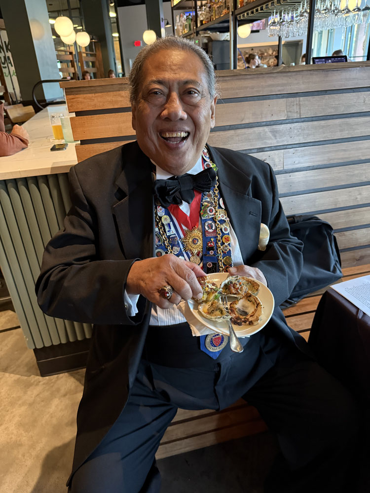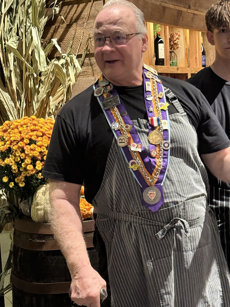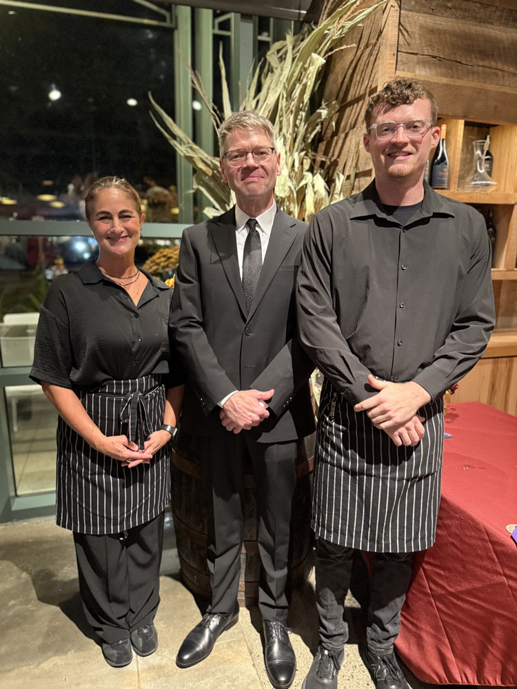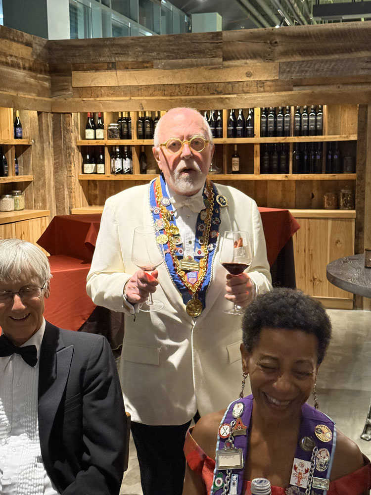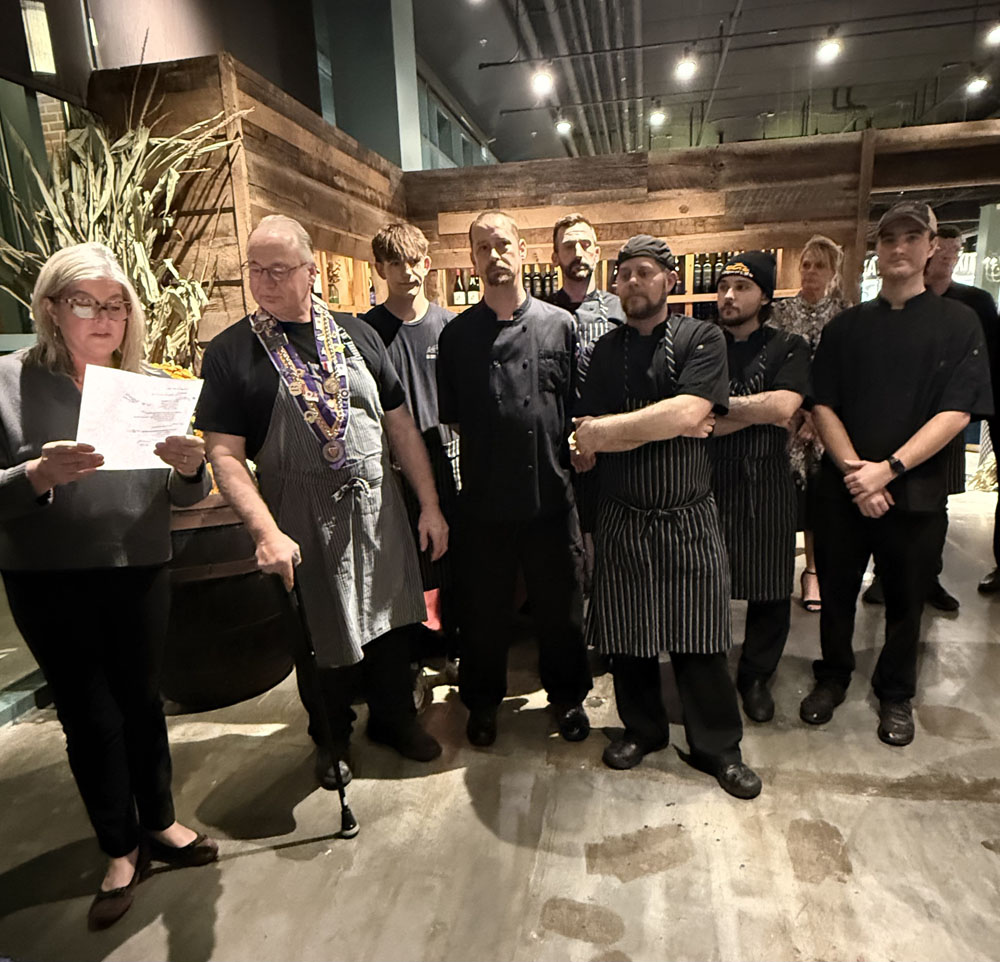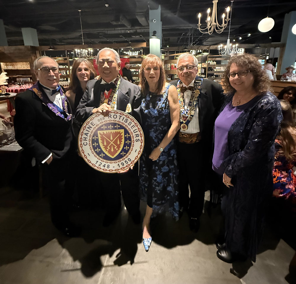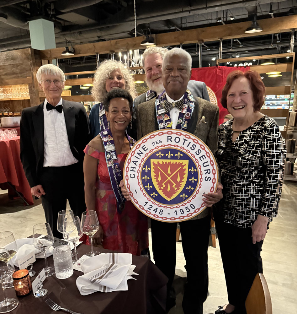 At the close of the evening, Mark and Jullie Delos and the kitchen staff and servers assembled for a round of applause from Chaîne members and guests. As is custom, Bailli William Harris presented a Chaîne plaque to the The Market Restaurant and Bar, as well as a Chaîne pin to each employee.