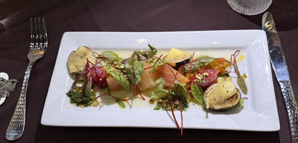 Garlic in pistachio gremolata made for a striking foil to Chioggia beets, red sorrel, and fresh figs showered in sherry vinaigrette. Two wines were poured with the salad: Chateau Gaudrelle “Clos le Vigneau” Vouvray 2022, and Kenwood “Six Ridges” Chardonnay, Russian River Valley 2020. Asked to vote that evening, cries of “Vouvray” rose from the crowd though a less rowdy few found the chardonnay’s oak a better fit.