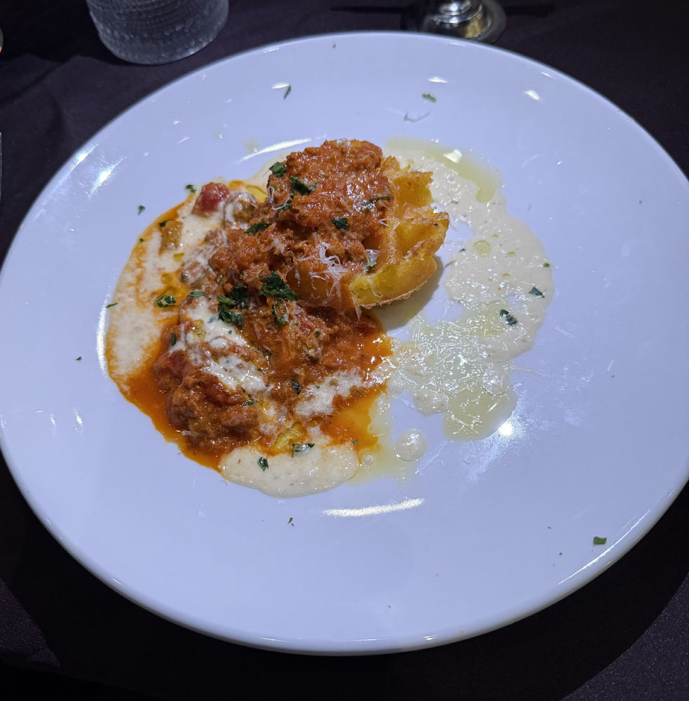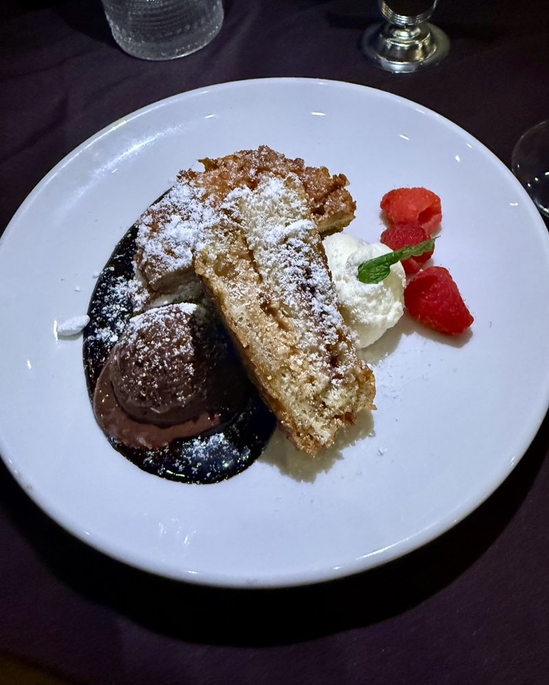 Now how to follow waffles and meatloaf? Peanut butter and raspberry jelly, of course, layered inside an ambitious little deep-fried disk crusted with cornflakes, cinnamon, and sugar, and accompanied by chocolate mousse gelato and Graham’s Ten-Year Tawny Port. Thus, the evening ended, though someone, somewhere still shouts “Vouvray, Vouvray.”