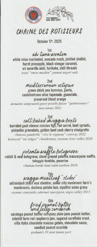 Six months after Franklin Square Market opened, its founding partner left. Enter two veterans of the Capital Region food scene, Maître Rôtisseur Mark Delos, the market’s Director of Culinary, and wife Jullie, Director of Hospitality and Operations. For the Albany Chaîne’s visit, Chef Delos devised a menu that bestowed whimsy on classics, and Jullie added the warmth of a haybarn party in autumn. Colossal dried hydrangeas proclaimed the season on a reception table where leaf-patterned Candelaria burned. Light bounced off rows of gleaming stemware on side tables, omens of seven wines to come at dinner. Tall cornstalks, mums, and pumpkins adorned a canapé table—my favorite was burrata with grilled peaches and plums, roasted onion, and mint. And then there was pizza, tada! Billed as ‘Mini Tomato Torta,’ slim triangles of moist, featherweight dough underpinned warm ricotta, parmesan and heirloom tomato confit. Inches away rested a platter of oysters grilled with pancetta herb garlic butter, and a nearby elaborate raw oyster bar drew fans. Crab cakes passed by on trays, while at each place setting a party favor waited: a bar of Fleur de Sel from Saratoga Chocolate Company.